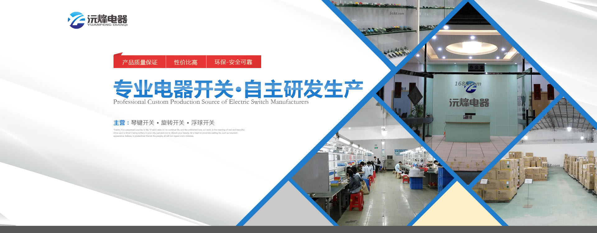 佛山市順德區沅烽電器有限公司是一家自主研發及生產各種電器開關以及接線端子座企業,產品主要有浮球開關、琴鍵開關、旋轉開關、微動開關、按鍵開關等系列,產品廣泛應用在空調、電風扇、電飯煲、電暖器、電烤箱、微波爐、榨汁機、攪拌機等家電行業。 本公司提供產品從設計開發到制造檢驗及跟蹤服務的全部流程,自主擁有模具設計制造、自動沖壓、精密注塑成型及組裝等部門。公司不斷完善檢測體系并引進高精度檢測儀器,其中有被美國安全試驗檢驗公司即UL公司認可的安規實驗室。 本公司于2003年通過并實施ISO9001國際品質管理認證體系,產品相繼獲得CQC、CE、TUV、UL認證,同業內眾多知名企業如美的、TCL、海信科龍、格蘭仕等保持長期的合作關系,有部分產品出口多個國家。 我們堅持走專業化的道路,以一流的產品及服務答謝客戶,愿與各界朋友共創美好明天...        查看更多